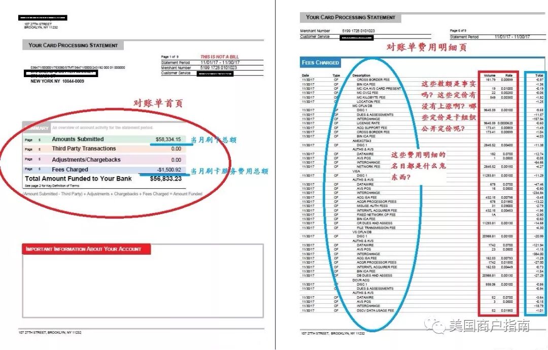这两类费用的明细通常都在您的对账单的费用明细部分中详细载明,但绝大多数商户业主及其会计是看不懂这个人为故意复杂化的费用明细的具体内涵的,也就是无法从故意混序排列的诸多费用明细中区分出哪些是卡组织交易费,哪些是刷卡机公司加收服务费。